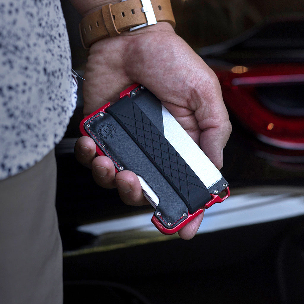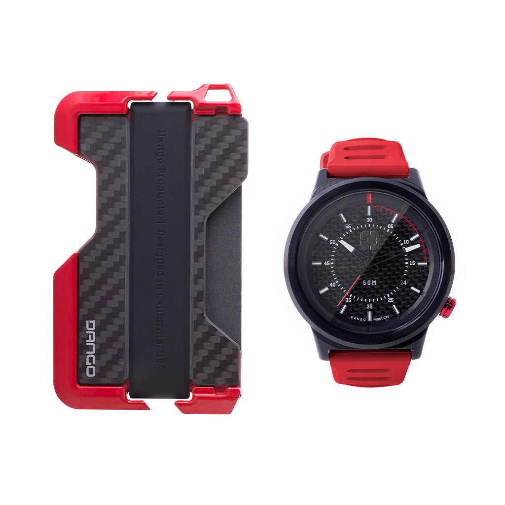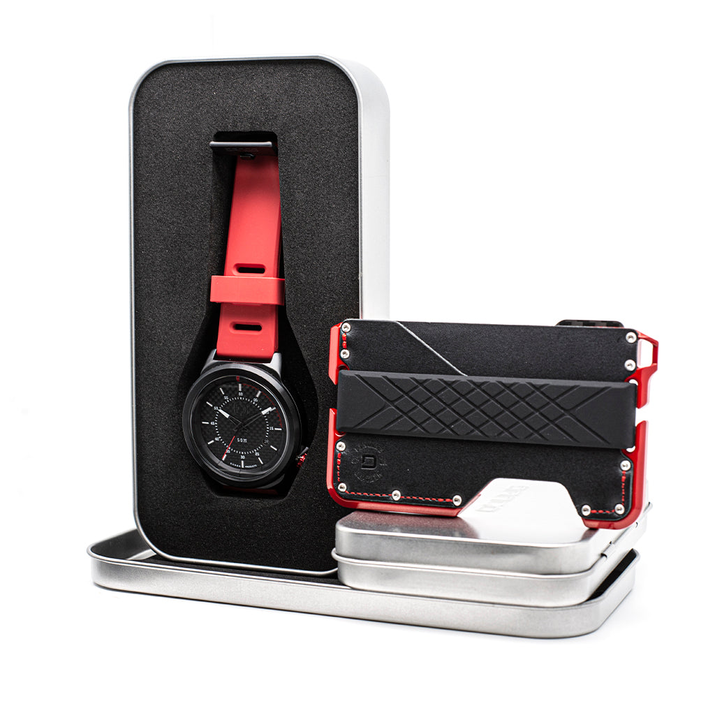 For those who love to burn rubber, are driven by the smell of fuel and are addicted to speed, this is the bundle for you! Inspired by performance motor sports and the automotive industry, the R-Spec wallet and watch bundle is the official dynamic duo! Machined out of 6061 aerospace aluminum, the glossy red powder coated D01 Dapper Wallet uses a genuine carbon fiber backplate, top grain leather pocket and an elastic silicone band to hold up to 12 cards and cash.