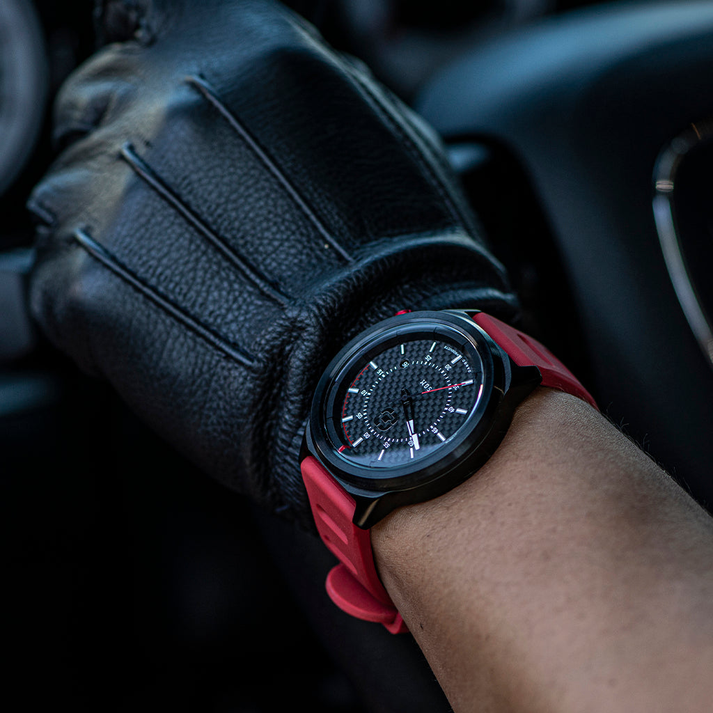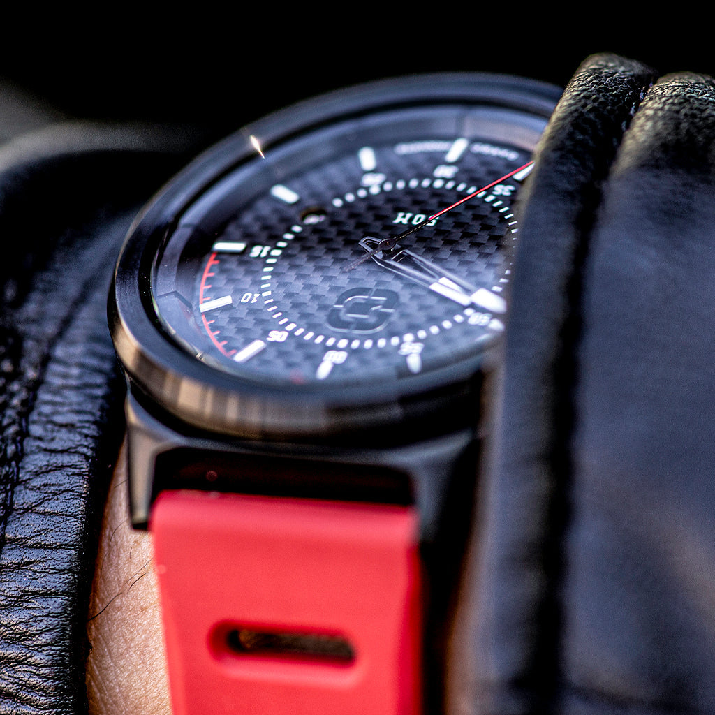 The counter part R-Spec watch is also designed with a classic 2 hands style, genuine carbon fiber face, made with Japanese Miyota 2315 movement and equipped with a domed mineral crystal glass. It also comes with quick release red silicone bands for a premium look & feel.
