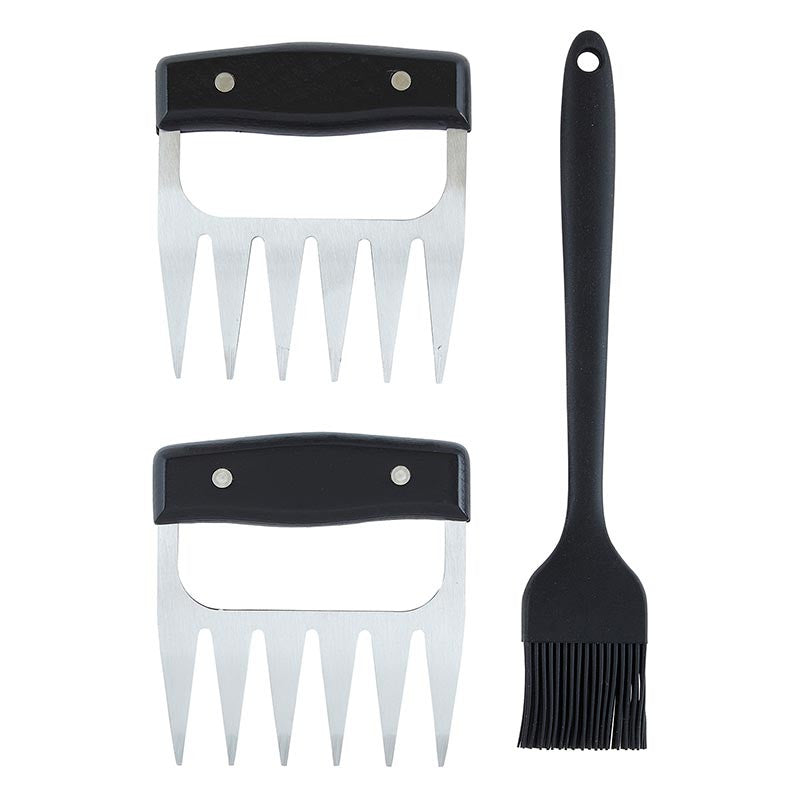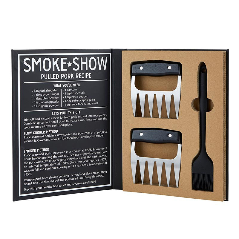 The perfect gift for the meat lover. This set includes 2 stainless steel meat shredding claws with comfortable wood handles and silicone basting brush in a fun book box.
