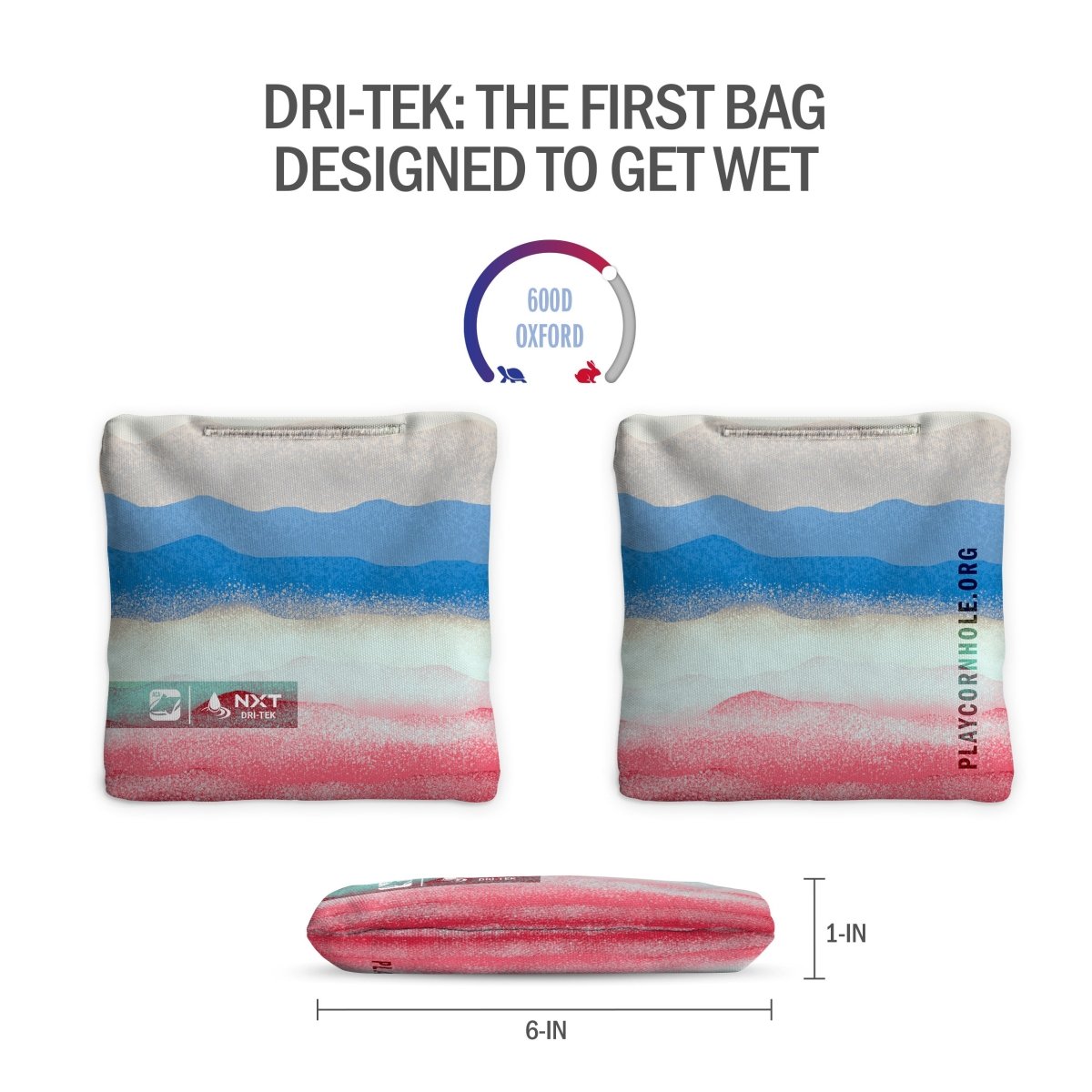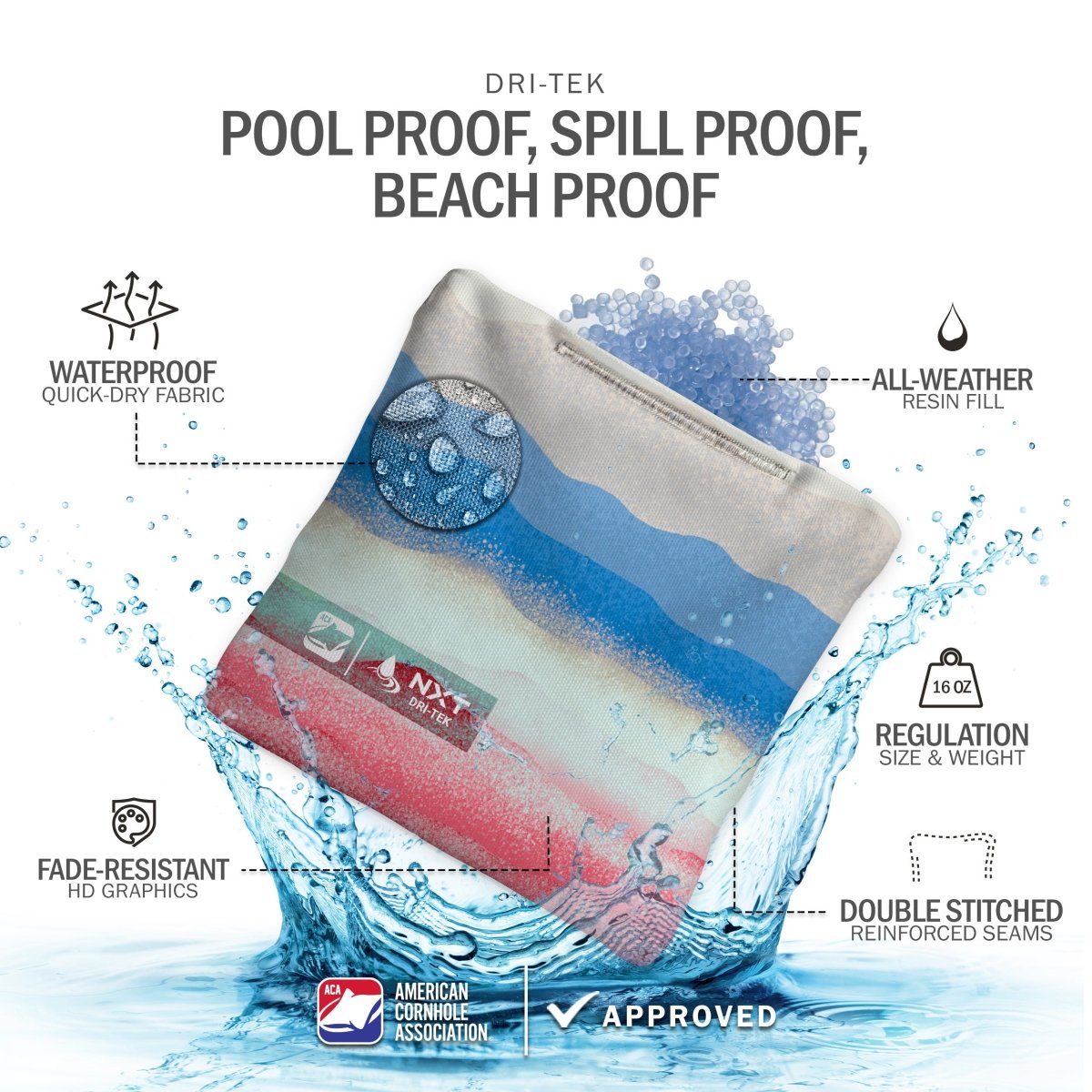 The Dri-Tek Bag is built to handle whatever the day throws at it—whether that's poolside tosses, beach games, or surprise spills. Made with moisture-repellent fabric, these bags float in water, dry fast, and never bloat or grow mold. With premium all-weather resin filling and reinforced stitching, the NXT Dri-Tek cornhole bag is made for players who never let a little water ruin the fun.