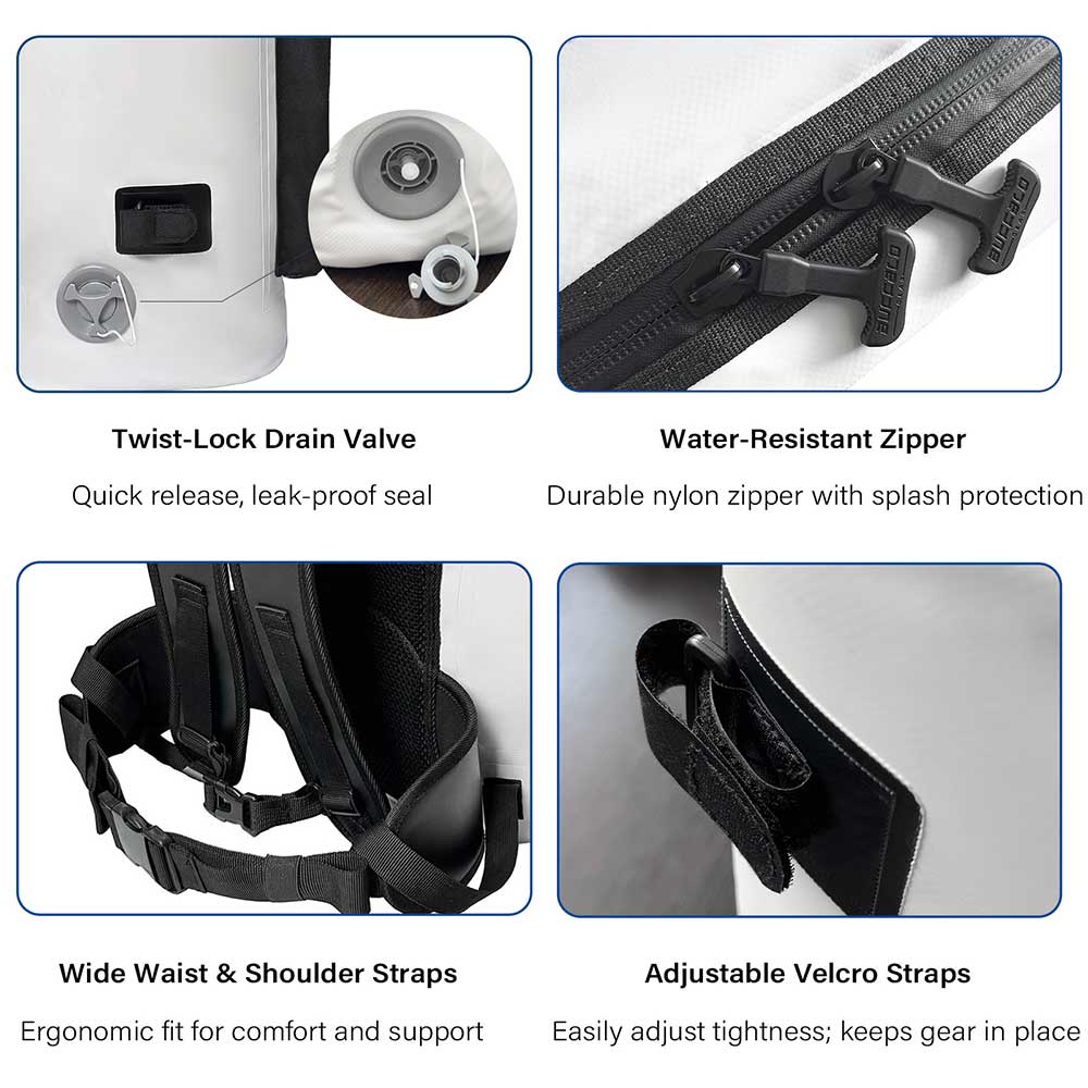 Made from durable 22oz double-sided tarpaulin with heat-welded seams, this backpack prevents leaks, odors, and spills—ideal for storing fish, ice, or drinks.