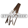 Made with synthetic leather, it has a 2" x 18" shoulder strap & brass hardware, this works well with most any "two hole" willow or rattan creels.