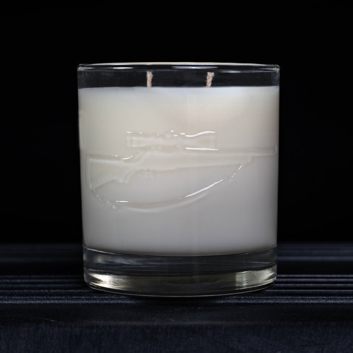 This candle is hand-poured into an American made heavy bottom whiskey rocks glass embossed with a scoped hunting rifle, which you can feel. When you're done burning your candle, clean it out and keep the glass forever.