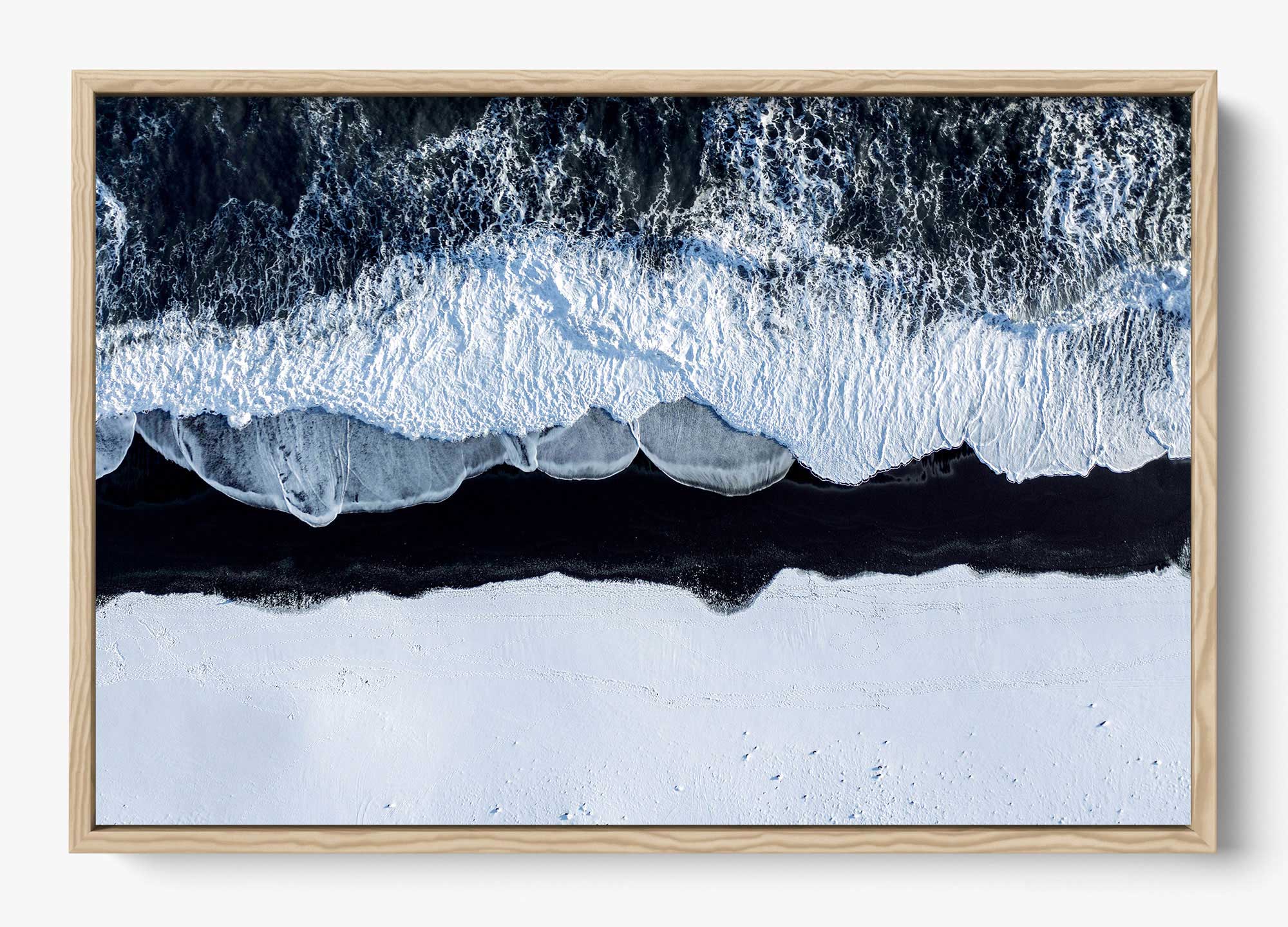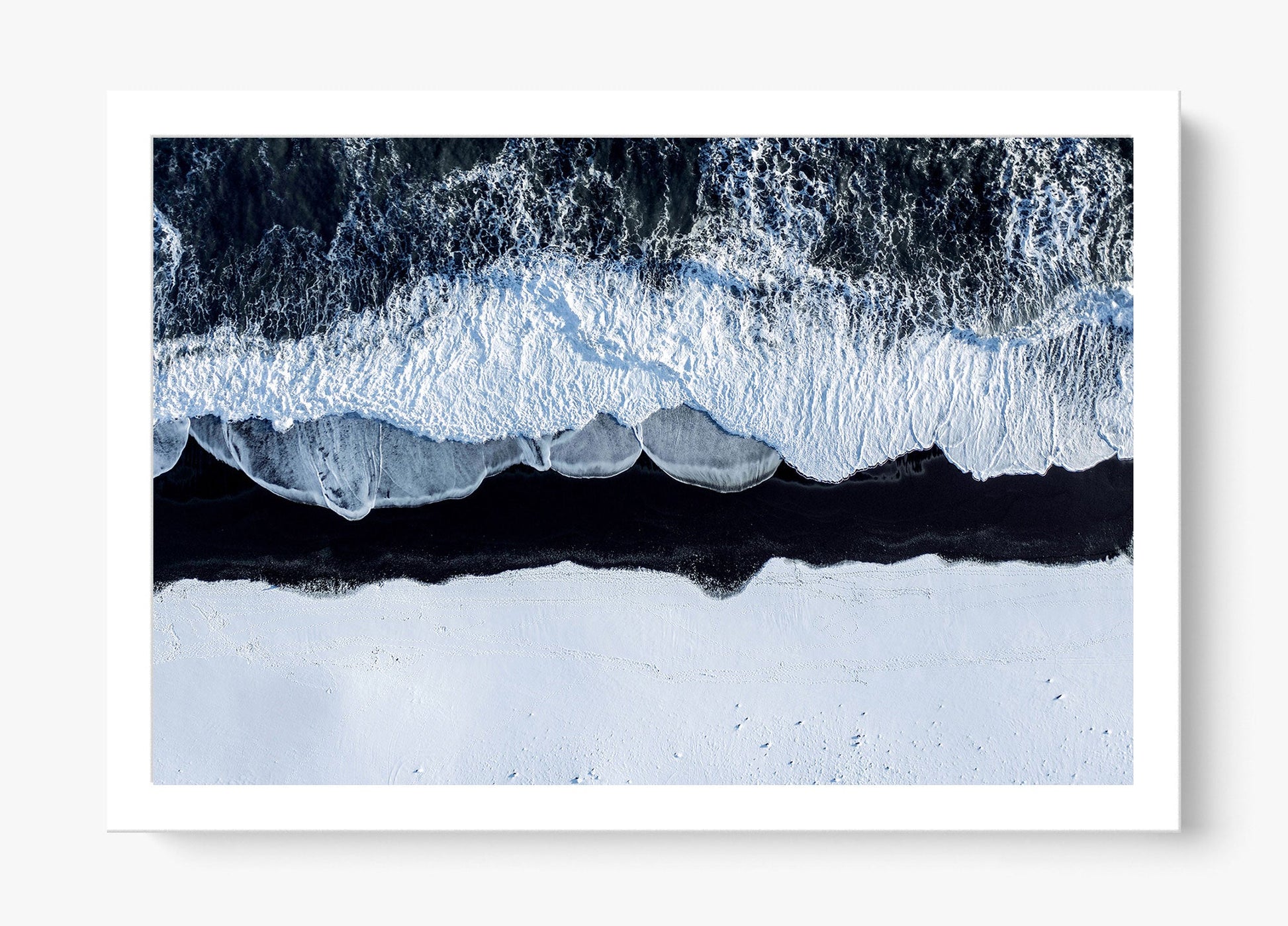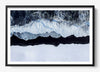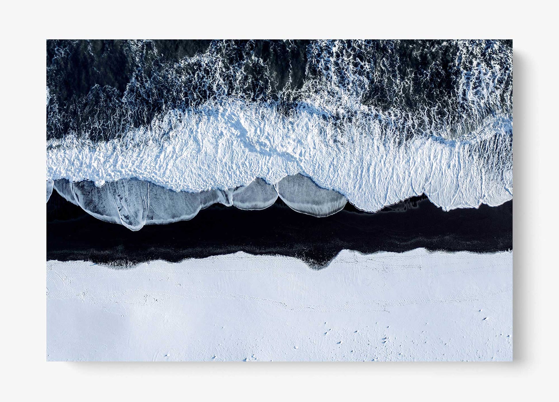 A stark winter shoreline where foaming tides collide with snow-covered volcanic black sand, creating a striking contrast of motion and stillness. Viewed from above, this piece feels both elemental and meditative - nature distilled to its purest form.