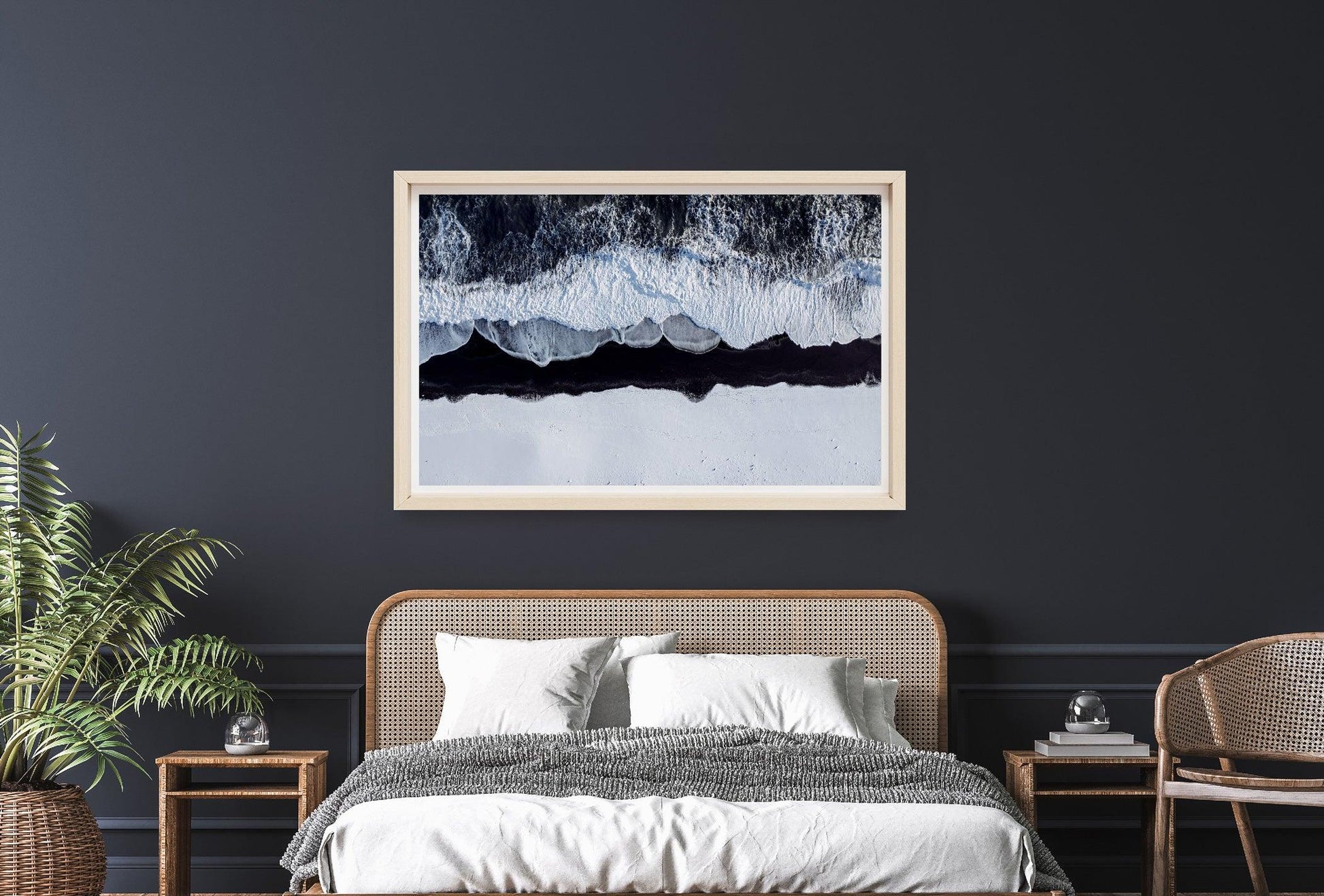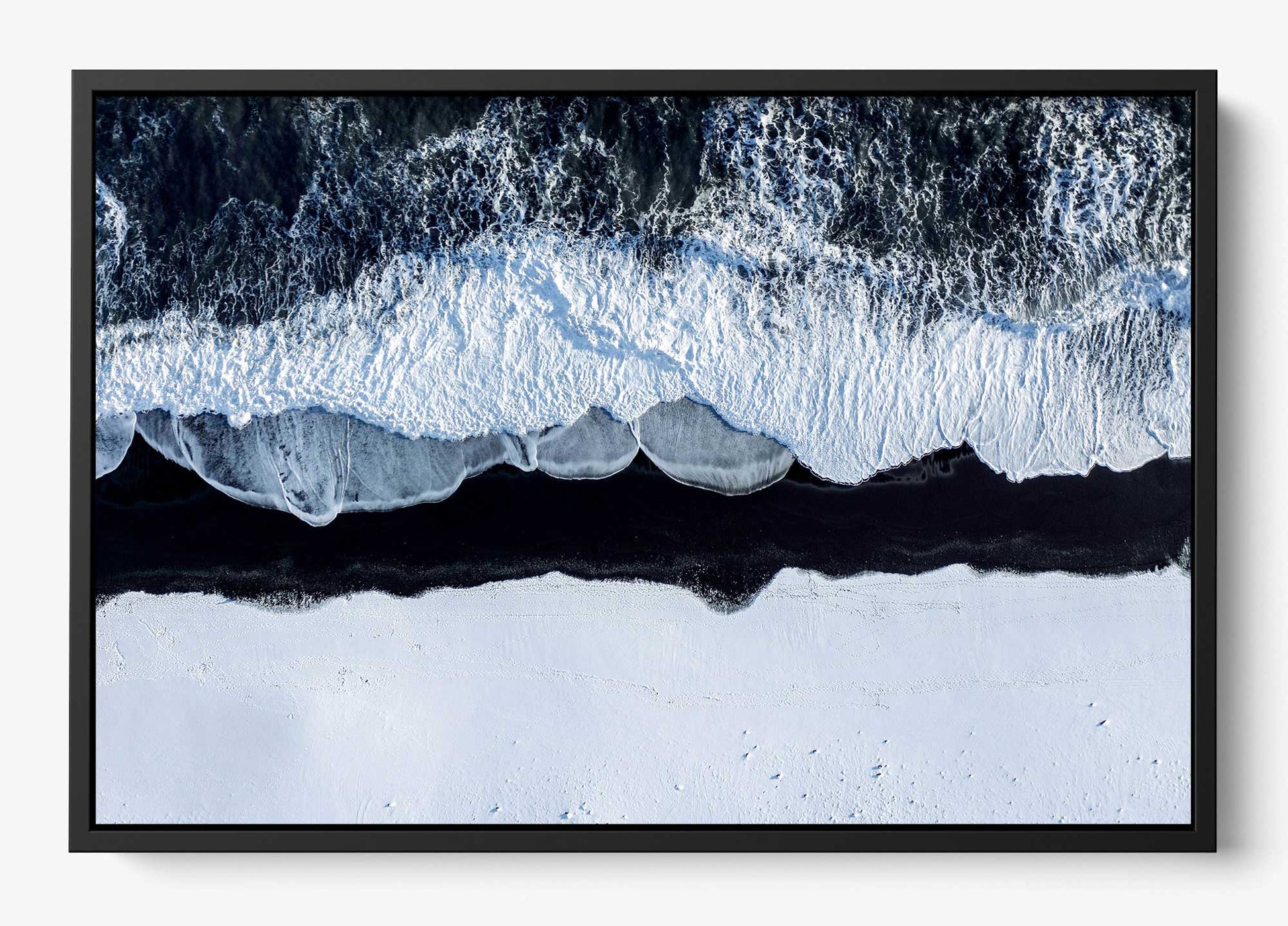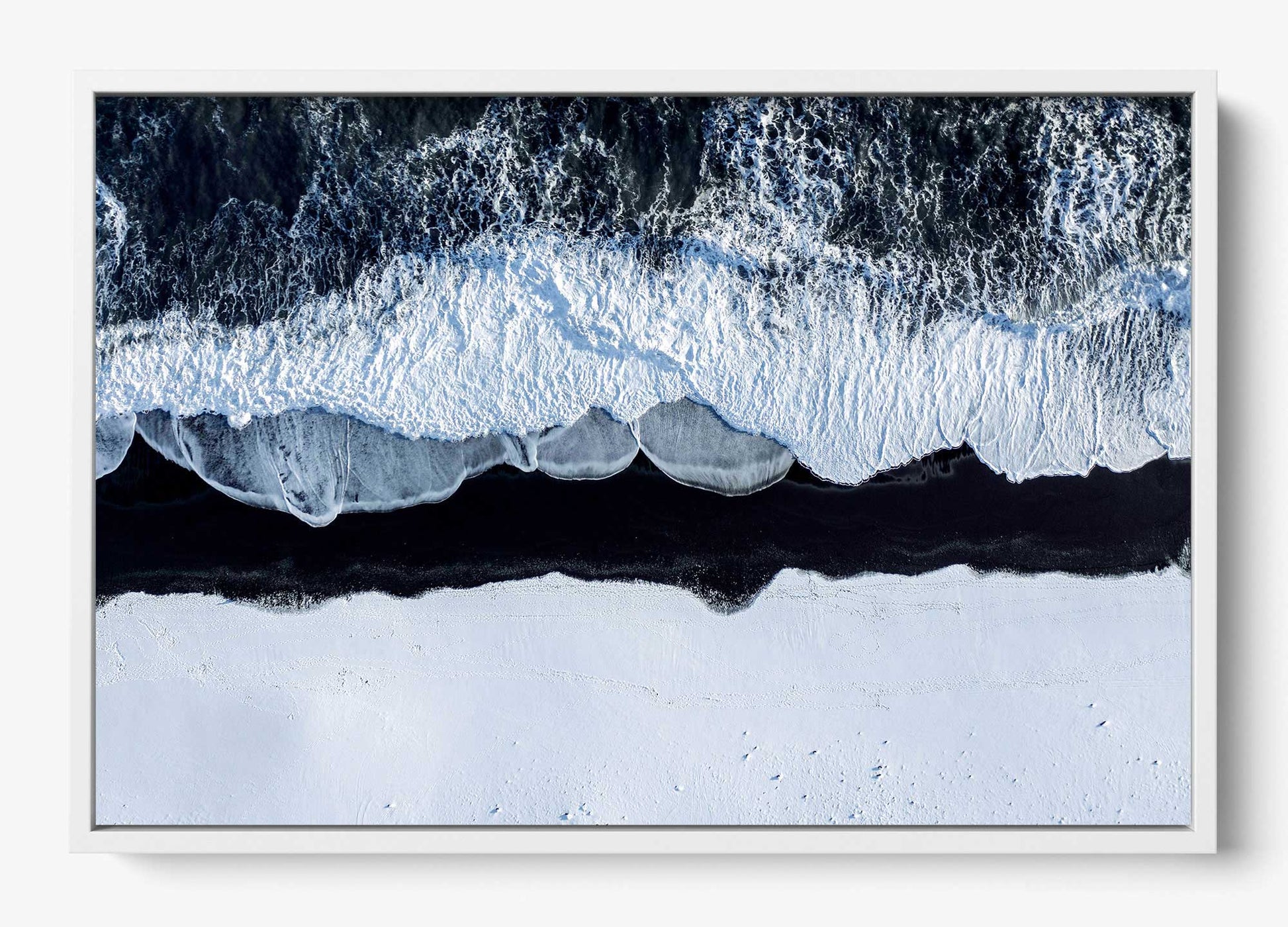 A stark winter shoreline where foaming tides collide with snow-covered volcanic black sand, creating a striking contrast of motion and stillness. Viewed from above, this piece feels both elemental and meditative - nature distilled to its purest form.