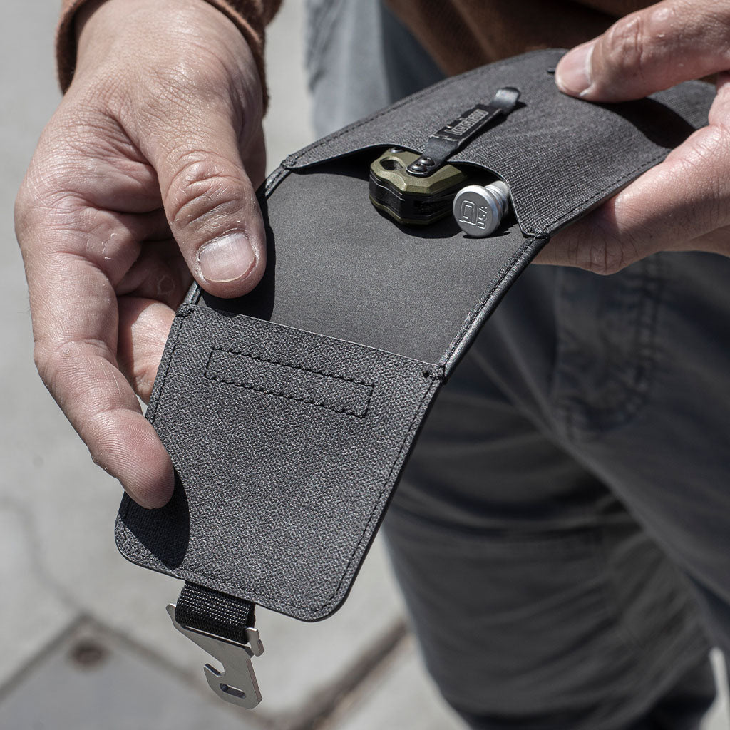 Made of water resistant DTEX material and secured by the MT01 Clasp & slot, the CA02 delivers comfort and durability. The CA02 is equipped with two inner pockets, one large pocket and one small velcro pocket for micro carry. In addition, a large through slot in the back allows the pouch to also function as a holster for belts and straps.