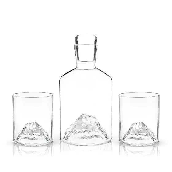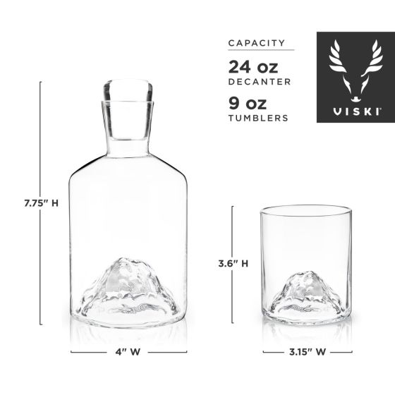 Display your liquor in style with this unique mountain decanter and tumbler set. This crystal liquor decanter set pays homage to the lofty peaks of the Pacific Northwest with a hand-blown, dimensional mountain base. These handmade items may exhibit slight variations.