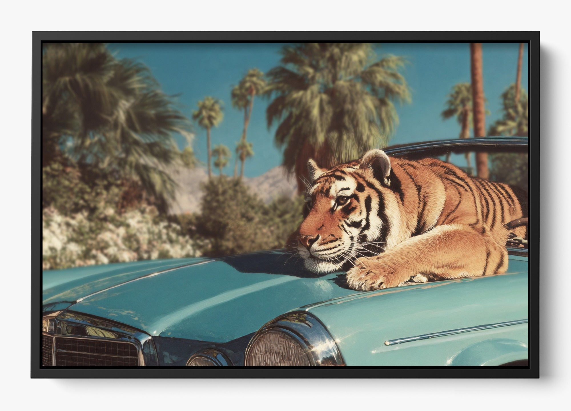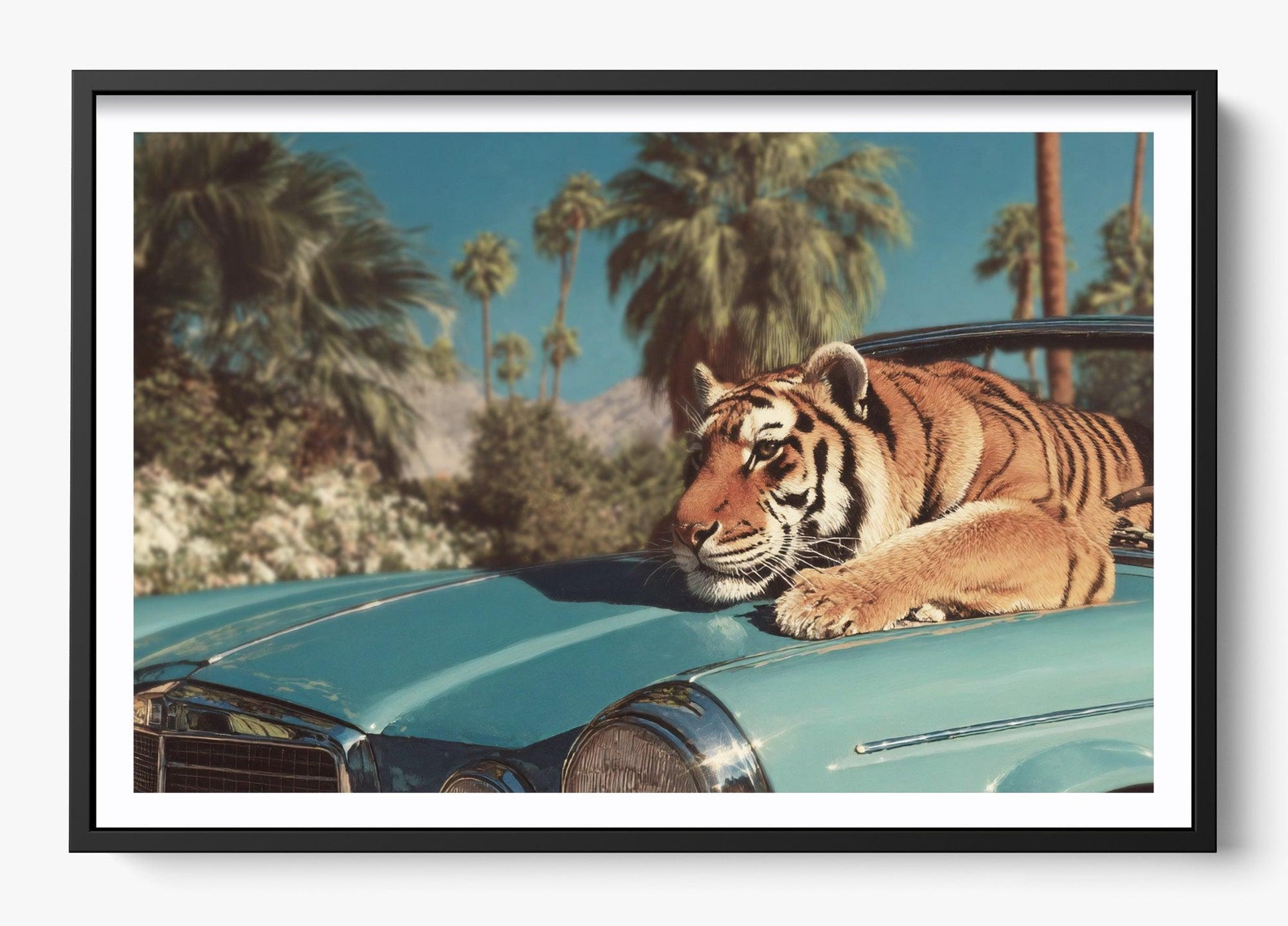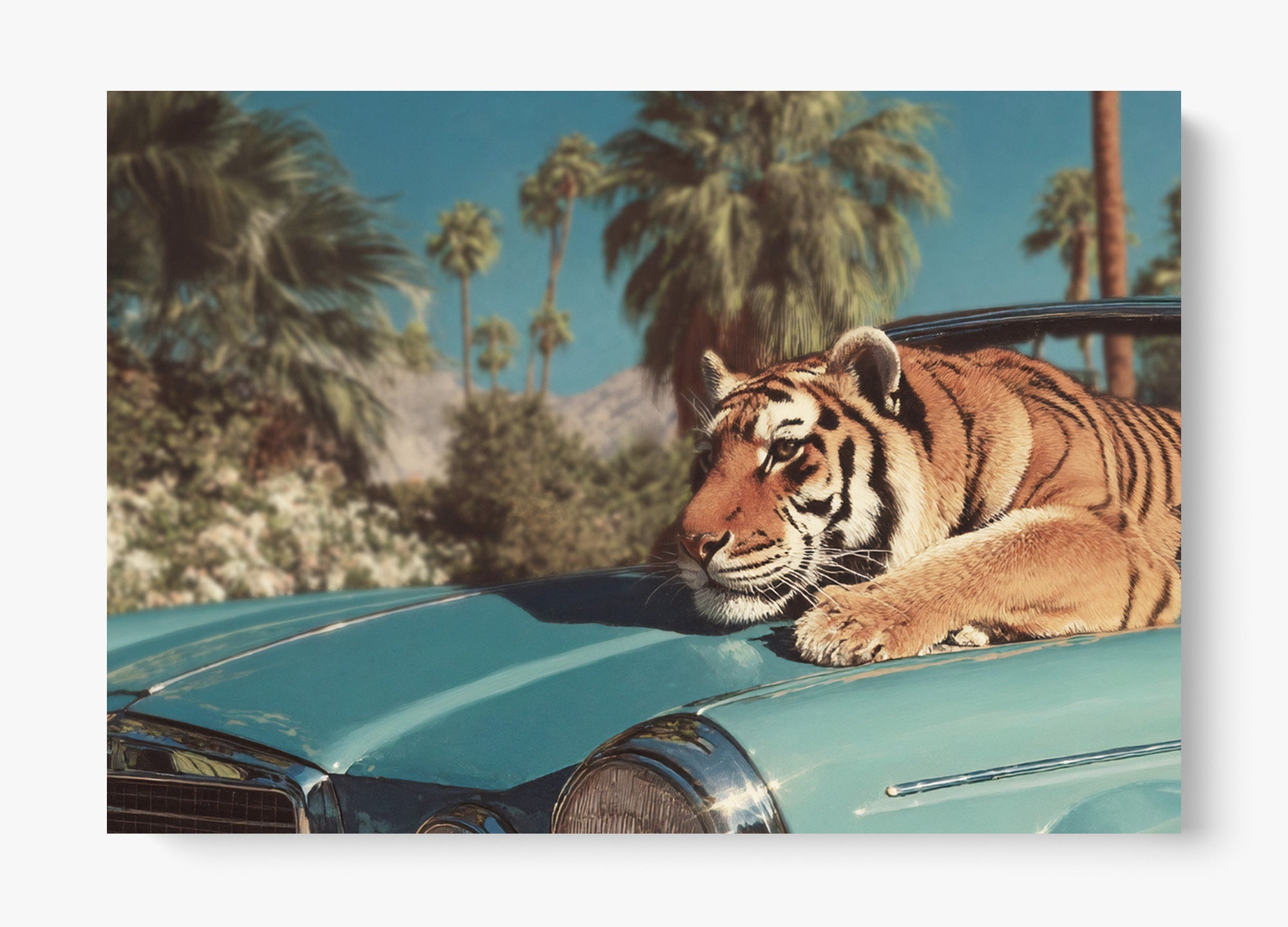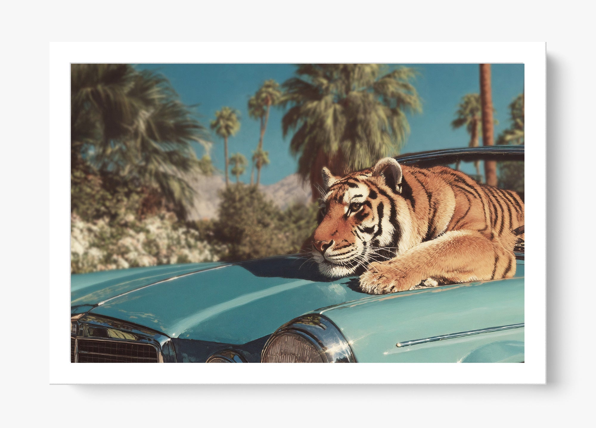 This remarkable artwork was thoughtfully crafted by a designer at Helm & Oar. By blending a striking, natural photograph of a Siberian tiger with the timeless elegance of a classic staging car in Los Angeles, we’ve created a powerful visual narrative—capturing the fierce grace of a predator guarding what is hers.