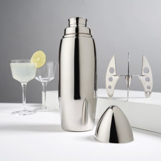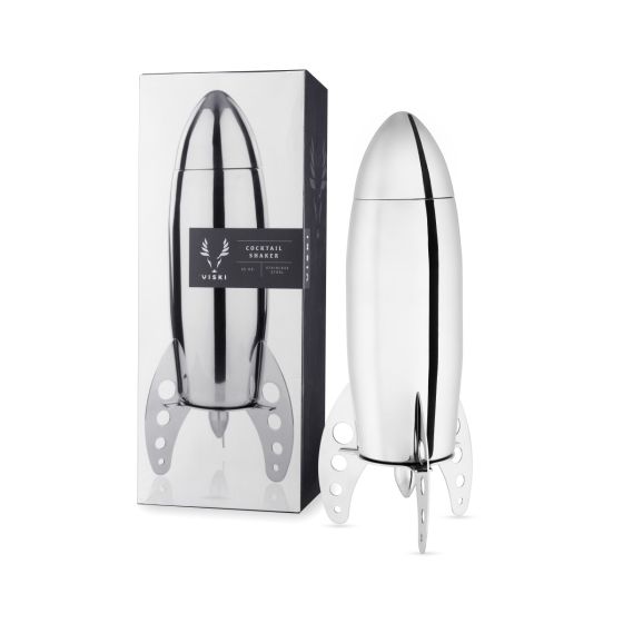 Sleek and space-worthy, our retro stainless steel rocket cocktail shaker holds 24 ounces incorporating a strainer, lid, capsule-esque cap, aerodynamic body and launch-ready shaker stand. Hand wash recommended.