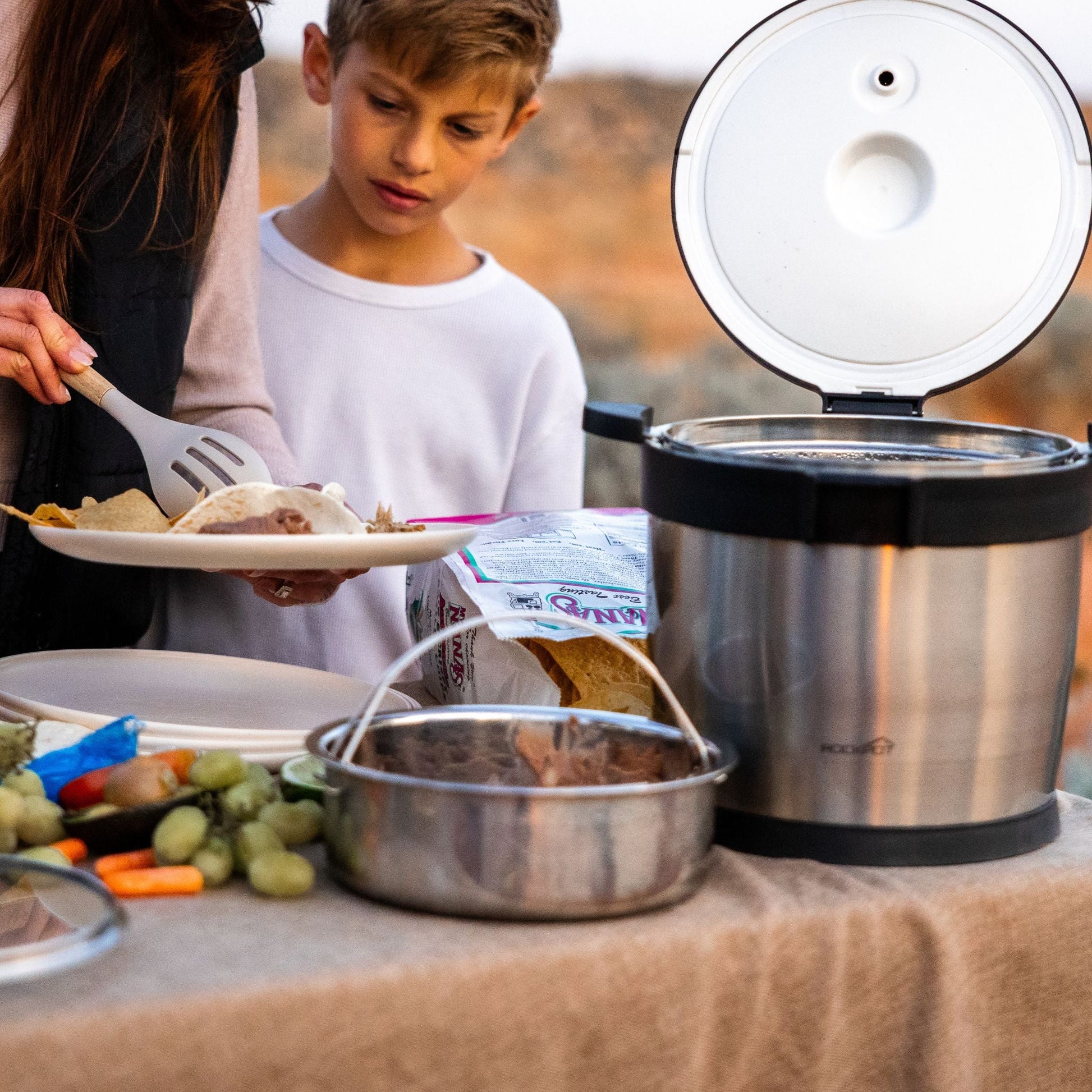 The RockPot is an easy-to-use portable cooker that requires no propane or electricity that can cook raw food. The RockTablet is our stone-based heating source for RockPot and can be heated over an open fire or over a stovetop (gas, electric, glass or butane) and can be reheated over thousands of times.