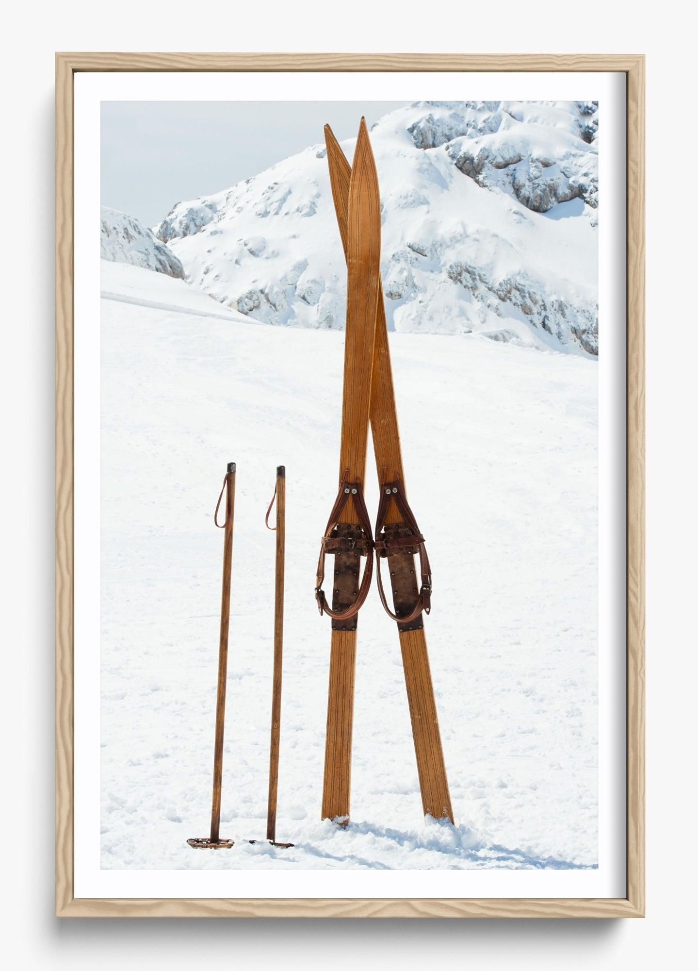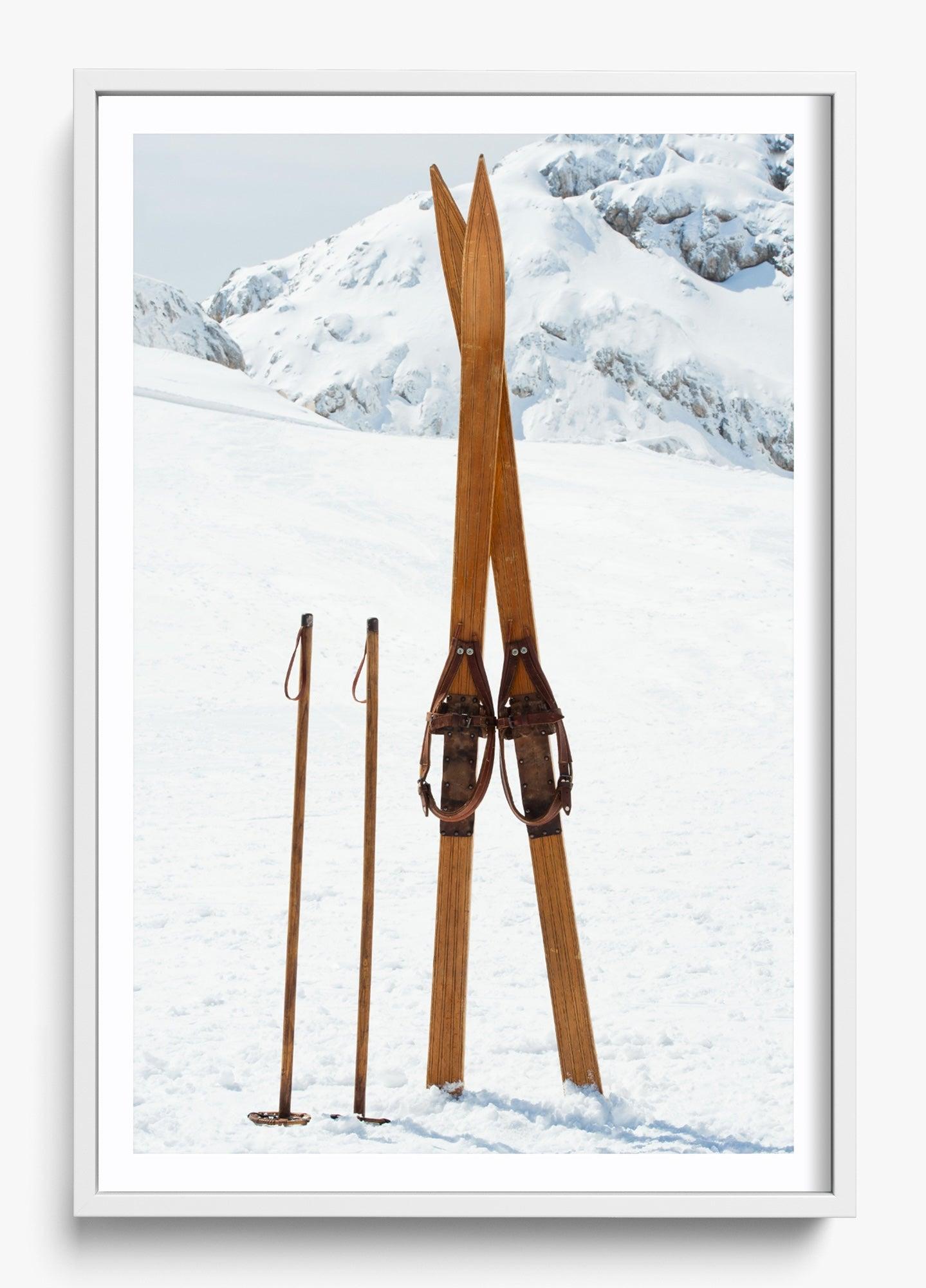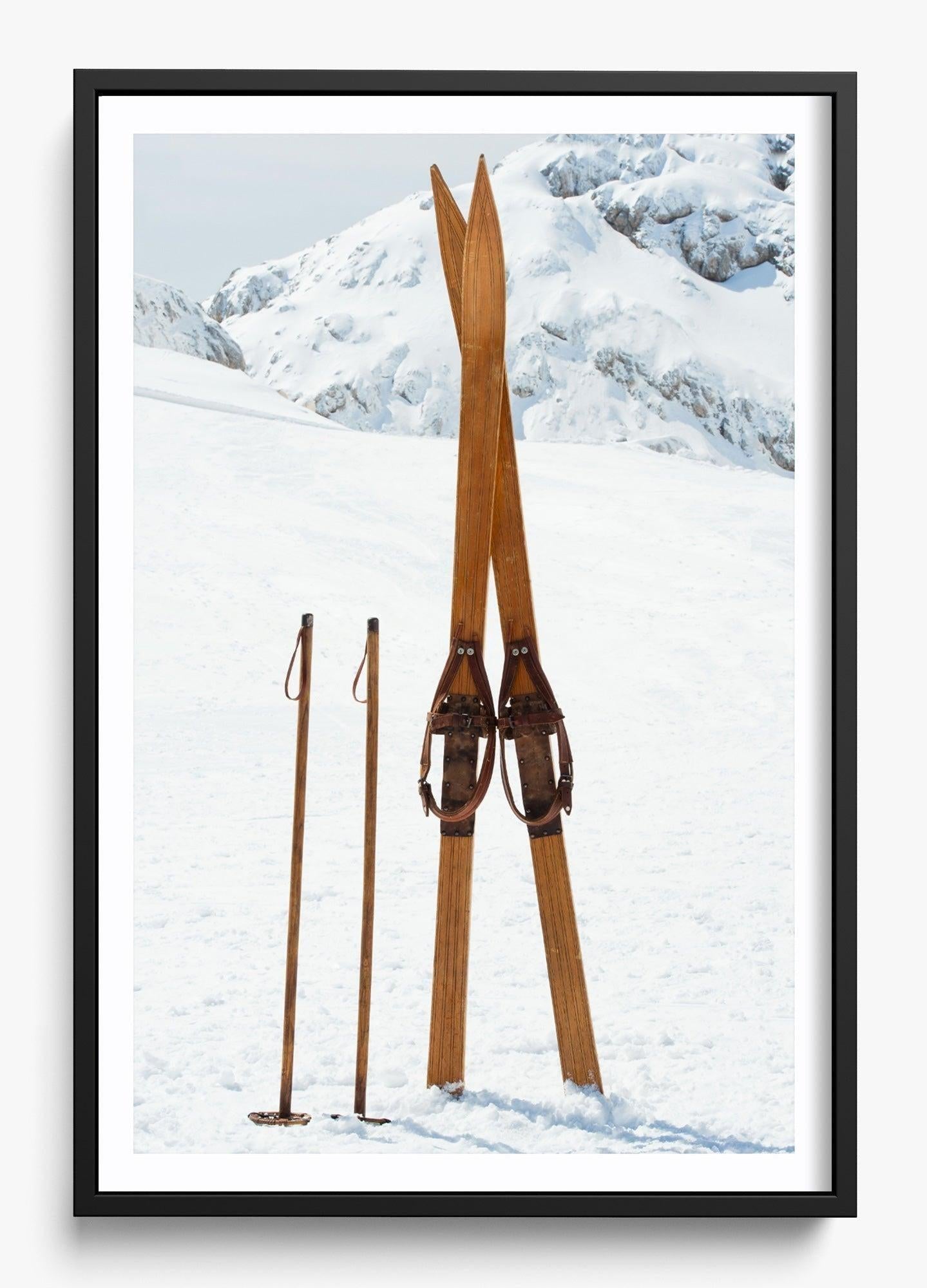 This image was captured on a perfectly still winter morning. These vintage wooden skis had been left standing in the powder, and something about their simplicity against the untouched white landscape stopped us in our tracks.
