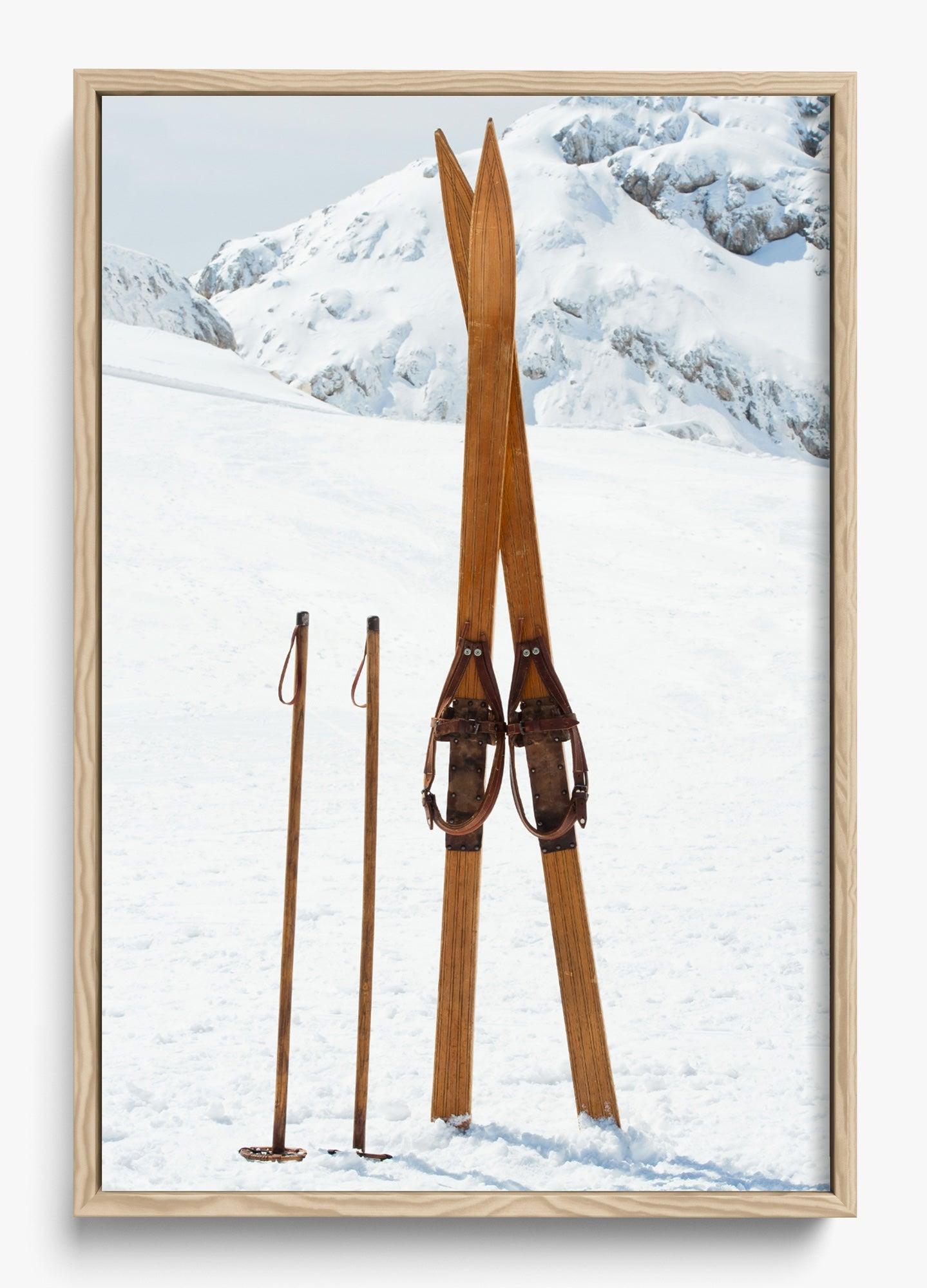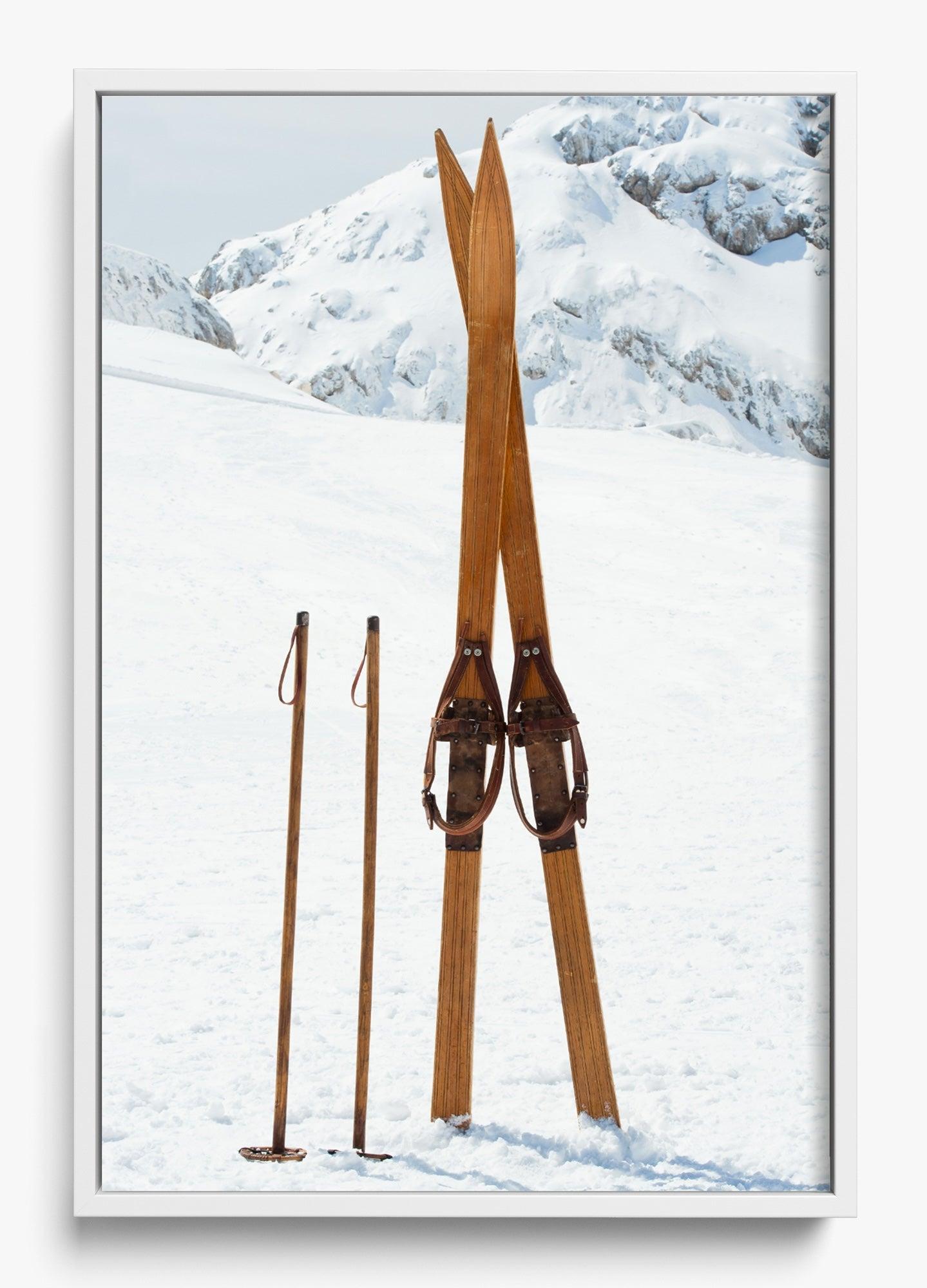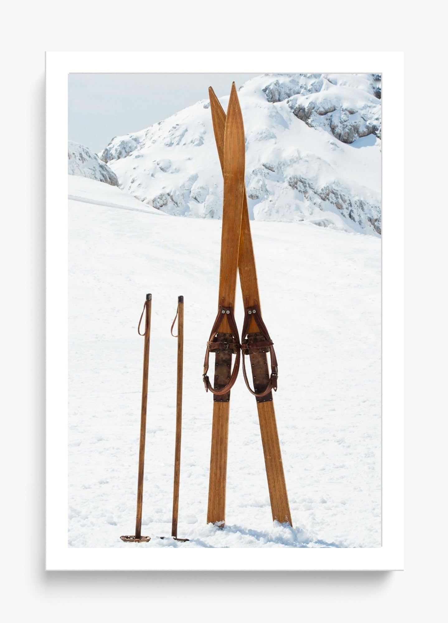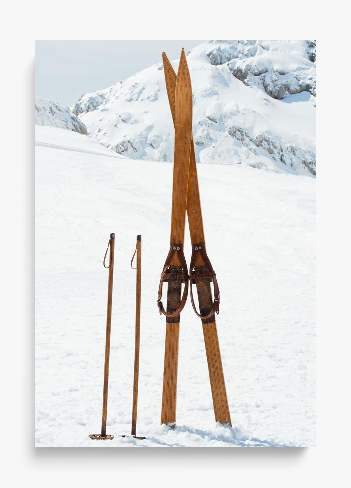 This image was captured on a perfectly still winter morning. These vintage wooden skis had been left standing in the powder, and something about their simplicity against the untouched white landscape stopped us in our tracks.