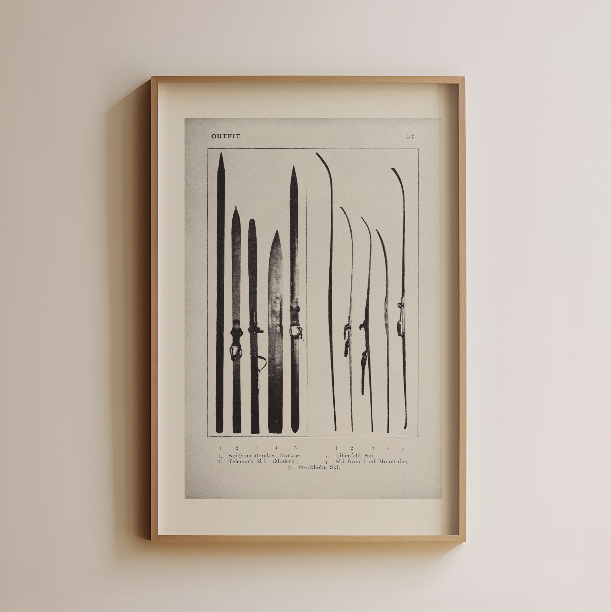 Elevate your home or office décor with our stunning vintage skis poster, a must-have for any winter sports enthusiast or mountain adventurer. Featuring vintage wooden skis for the alpine landscape with fresh powder, this high-quality art print envokes the thrill and beauty of skiing and exploring snow-covered peaks. Perfect for creating a cozy cabin vibe or a stylish touch of the outdoors in any space.